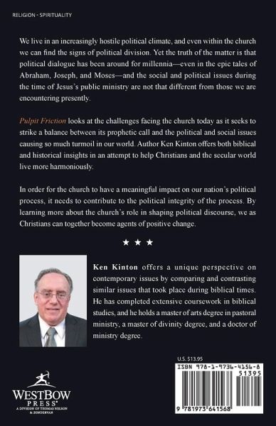 We live in an increasingly hostile political climate, and even within the church we can find the signs of political division. Yet the truth of the matter is that political dialogue has been around for millennia-even in the epic tales of Abraham, Joseph, and Moses-and the social and political issues during the time of Jesus's public ministry are not that different from those we are encountering presently. Pulpit Friction looks at the challenges facing the church today as it seeks to strike a balance between its prophetic call and the political and social issues causing so much turmoil in our world. Author Ken Kinton offers both biblical and historical insights in an attempt to help Christians and the secular world live more harmoniously. In order for the church to have a meaningful impact on our nation's political process, it needs to contribute to the political integrity of the process. By learning more about the church's role in shaping political discourse, we as Christians can together become agents of positive change.
