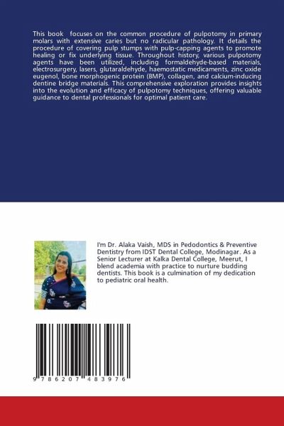 This book focuses on the common procedure of pulpotomy in primary molars with extensive caries but no radicular pathology. It details the procedure of covering pulp stumps with pulp-capping agents to promote healing or fix underlying tissue. Throughout history, various pulpotomy agents have been utilized, including formaldehyde-based materials, electrosurgery, lasers, glutaraldehyde, haemostatic medicaments, zinc oxide eugenol, bone morphogenic protein (BMP), collagen, and calcium-inducing dentine bridge materials. This comprehensive exploration provides insights into the evolution and efficacy of pulpotomy techniques, offering valuable guidance to dental professionals for optimal patient care.