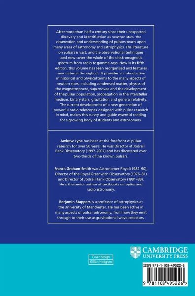 After more than half a century since their unexpected discovery and identification as neutron stars, the observation and understanding of pulsars touches upon many areas of astronomy and astrophysics. The literature on pulsars is vast and the observational techniques used now cover the whole of the electromagnetic spectrum from radio to gamma-rays. Now in its fifth edition, this volume has been reorganised and features new material throughout. It provides an introduction in historical and physical terms to the many aspects of neutron stars, including condensed matter, physics of the magnetosphere, supernovae and the development of the pulsar population, propagation in the interstellar medium, binary stars, gravitation and general relativity. The current development of a new generation of powerful radio telescopes, designed with pulsar research in mind, makes this survey and guide essential reading for a growing body of students and astronomers.