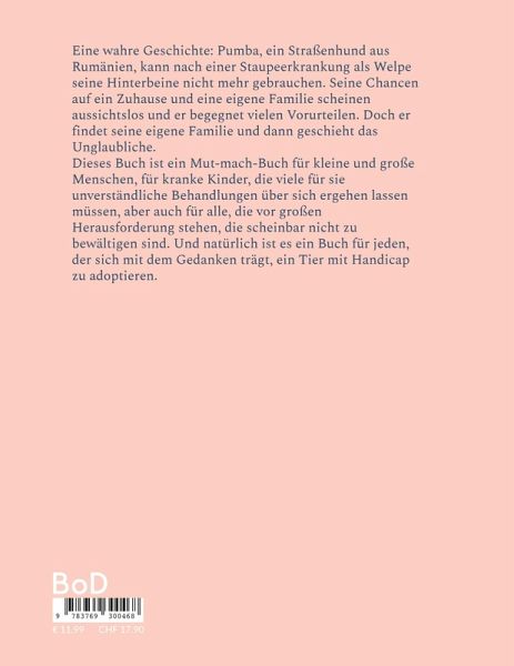 Eine wahre Geschichte: Pumba, ein Straßenhund aus Rumänien, kann nach einer Staupeerkrankung als Welpe seine Hinterbeine nicht mehr gebrauchen. Seine Chancen auf ein Zuhause und eine eigene Familie scheinen aussichtslos und er begegnet vielen Vorurteilen. Doch er findet seine eigene Familie und dann geschieht das Unglaubliche. Dieses Buch ist ein Mut-mach-Buch für kleine und große Menschen, für kranke Kinder, die viele für sie unverständliche Behandlungen über sich ergehen lassen müssen, aber auch für alle, die vor großen Herausforderung stehen, die scheinbar nicht zu bewältigen sind. Und natürlich ist es ein Buch für jeden, der sich mit dem Gedanken trägt, ein Tier mit Handicap zu adoptieren.
