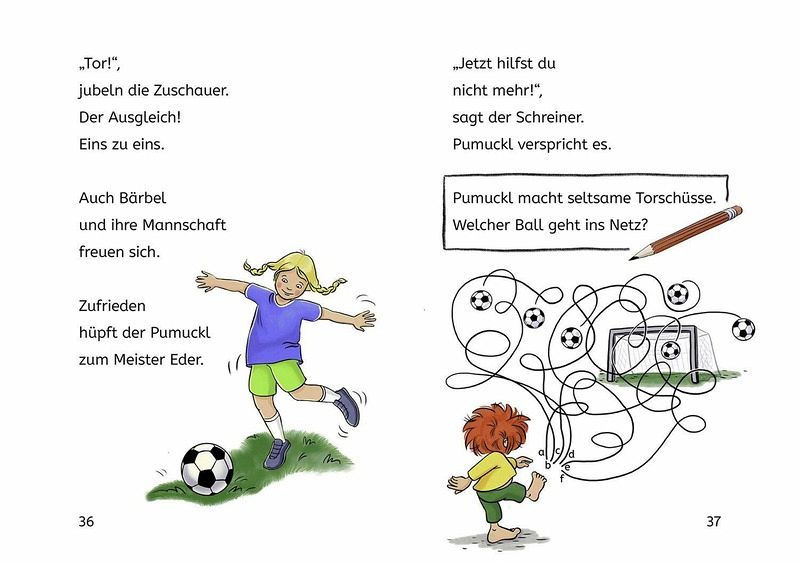 Das lustigste Fußballspiel aller Zeiten! Meister Eder nimmt Pumuckl zu einem wichtigen Spiel mit. Natürlich geht es auf dem Sportplatz bald drunter und drüber: Pumuckl schnappt einem Kind die halbe Bratwurst weg, wird spontan zum Stadionsprecher und stellt sich einfach selbst ins Tor. Warum wundern sich alle, dass der Fußball so komisch fliegt und die Halbzeitpause ungewöhnlich kurz ist? Am Ende bekommt Pumuckl von Meister Eder einen kleinen Pokal geschenkt. Großer Schabernack mit dem beliebten Kobold. Sechs lustige Kapitel in Fibelschrift - mit witzigen Reimen, tollen Pumuckl-Illustrationen und Leserätseln.