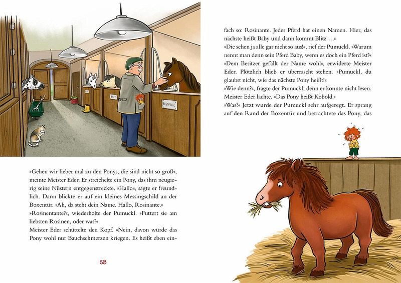 Beispielweise sorgt Pumuckl unbeabsichtigt für große Verwirrung auf dem Reiterhof. Denn das kleine braune Pony heißt Kobold und natürlich fühlt sich der Pumuckl - auf dem Rücken des Ponys sitzend - sogleich angesprochen und antwortet fröhlich. Zu dumm, dass nun alle Kinder denken, das Pony namens Kobold könne sprechen.