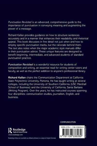 Punctuation Revisited is an advanced, comprehensive guide to the importance of punctuation in conveying meaning and augmenting the power of a message. Richard Kallan provides guidance on how to structure sentences accurately and in a manner that enhances their readability and rhetorical appeal. This book discusses in fine detail not just when and how to employ specific punctuation marks, but the rationale behind them. It also notes when the major academic style manuals differ in their punctuation advice. These unique features are designed to benefit beginning, intermediate, and advanced students of standard punctuation practice. Punctuation Revisited is a wonderful resource for students of composition and writing, an essential read for writing center tutors and faculty, as well as the perfect addition to anyone's professional library.