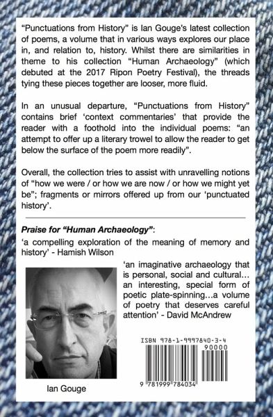 "Punctuations from History" is Ian Gouge’s latest collection of poems, a volume that in various ways explores our place in, and relation to, history. Whilst there are similarities in theme to his collection "Human Archaeology" (which debuted at the 2017 Ripon Poetry Festival), the threads tying these pieces together are looser, more fluid. In an unusual departure, "Punctuations from History" contains brief ‘context commentaries’ that provide the reader with a foothold into the individual poems: "an attempt to offer up a literary trowel to allow the reader to get below the surface of the poem more readily". Overall, the collection tries to assist with unravelling notions of "how we were / or how we are now / or how we might yet be"; fragments or mirrors offered up from our ‘punctuated history’.