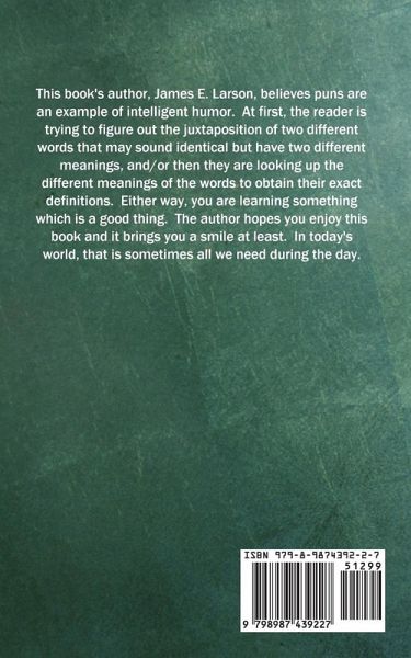 This book's author, James E. Larson, believes puns are an example of intelligent humor. At first, the reader is trying to figure out the juxtaposition of two different words that may sound identical but have two different meanings, and/or then they are looking up the different meanings of words to obtain their exact definitions. Either way, you are learning something which is a good thing. The author hopes you enjoy this book and it brings you a smile at least. In today's world, that is sometimes all we need during the day.