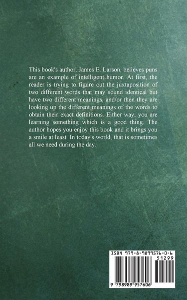 A collection of puns from the mind of James E. Larson, a pundamentalist, who believes you should know as much as you can about history. Like someone once told me that in the American Colonies, among the first group of people to arrive were an older group of men. They paid for their trip on the ship by promising to work for a certain amount of time without pay to pay off their debt for traveling on the ship. I was told these men all had false teeth. Hence, they were labeled as the first 'Indentured Servants.' This book's author, James E. Larson, believes puns are an example of intelligent humor. At first, the reader is trying to figure out the juxtaposition of two different words that may sound identical but have two different meanings, and/or then they are looking up the different meanings of the words to obtain their exact definitions. Either way, you are learning something which is a good thing. The author hopes you enjoy this book and it brings you a smile at least. In today's world, that is sometimes all we need during the day.