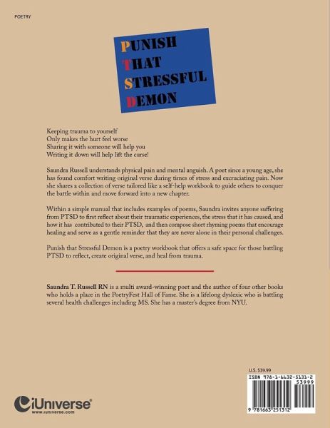 Keeping trauma to yourself Only makes the hurt feel worse Sharing it with someone will help you Writing it down will help lift the curse! Saundra Russell understands physical pain and mental anguish. A poet since a young age, she has found comfort writing original verse during times of stress and excruciating pain. Now she shares a collection of verse tailored like a self-help workbook to guide others to conquer the battle within and move forward into a new chapter. Within a simple manual that includes examples of poems, Saundra invites anyone suffering from PTSD to first reflect about their traumatic experiences, the stress that it has caused, and how it has contributed to their PTSD, and then compose short rhyming poems that encourage healing and serve as a gentle reminder that they are never alone in their personal challenges. Punish that Stressful Demon is a poetry workbook that offers a safe space for those battling PTSD to reflect, create original verse, and heal from trauma.