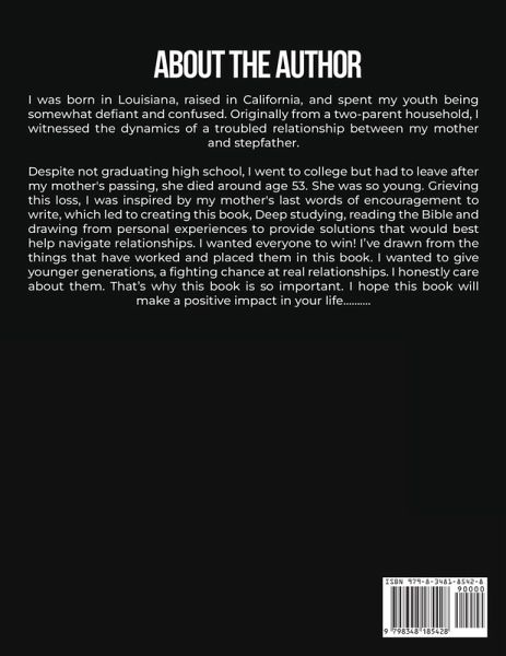 My decision to write this book have a lot to do with the dynamics of me growing up as well as watching the brokenness in relationships from a little hill till now. I acknowledge all of those who have came into my life and brought the knowledge, agitation, frustration, disbelief that I needed at that time. To my mother, pops, my brothers, cowboy, my daughters, and my sisters, Christine Jame, Sherry and of course Grace. But mostly to God. Who gave me the information and allowed me the time to put it on paper. May he forever be glorified. Amen