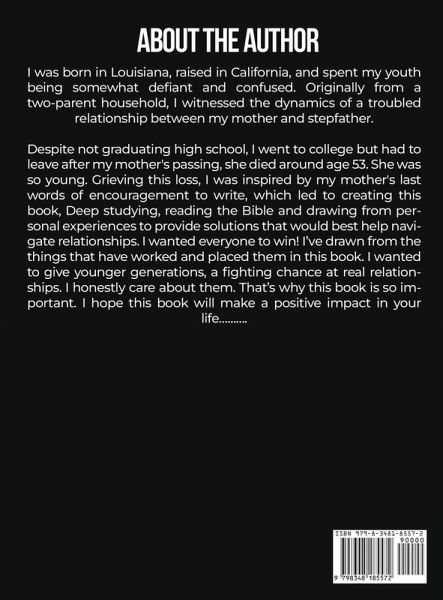 My decision to write this book have a lot to do with the dynamics of me growing up as well as watching the brokenness in relationships from a little hill till now. I acknowledge all of those who have came into my life and brought the knowledge, agitation, frustration, disbelief that I needed at that time. To my mother, pops, my brothers, cowboy, my daughters, and my sisters, Christine Jame, Sherry and of course Grace. But mostly to God. Who gave me the information and allowed me the time to put it on paper. May he forever be glorified. Amen
