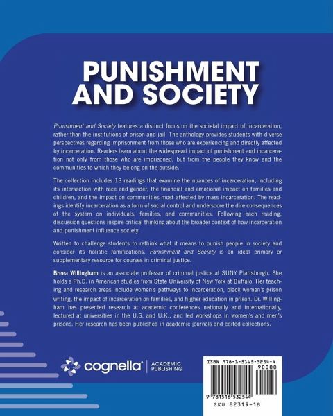 Punishment and Society features a distinct focus on the societal impact of incarceration, rather than the institutions of prison and jail. The anthology provides students with diverse perspectives regarding imprisonment from those who are experiencing and directly affected by incarceration. Readers learn about the widespread impact of punishment and incarceration not only from those who are imprisoned, but from the people they know and the communities to which they belong on the outside. The collection includes 13 readings that examine the nuances of incarceration, including its intersection with race and gender, the financial and emotional impact on families and children, and the impact on communities most affected by mass incarceration. The readings identify incarceration as a form of social control and underscore the dire consequences of the system on individuals, families, and communities. Following each reading, discussion questions inspire critical thinking about the broader context of how incarceration and punishment influence society. Written to challenge students to rethink what it means to punish people in society and consider its holistic ramifications, Punishment and Society is an ideal primary or supplementary resource for courses in criminal justice. Breea Willingham is an associate professor of criminal justice at SUNY Plattsburgh. She holds a Ph.D. in American studies from State University of New York at Buffalo. Her teaching and research areas include women’s pathways to incarceration, black women’s prison writing, the impact of incarceration on families, and higher education in prison. Dr. Willingham has presented research at academic conferences nationally and internationally, lectured at universities in the U.S. and U.K., and led workshops in women’s and men’s prisons. Her research has been published in academic journals and edited collections.