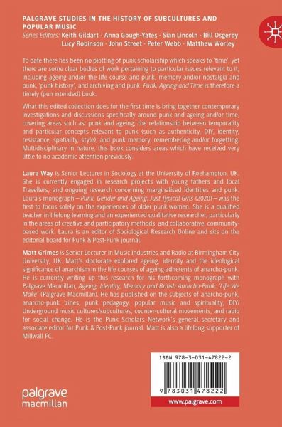 1. Introduction.- 2. Rejecting and Resisting Ageism: Female Perspectives of Ageing with Punk.- 3. Lifestyle and Memory: Profiling Two Generations of Ageing Czech Male Punks.- 4.'... And Out Come the Comps': Punk-O-Rama, ProSkater, and Their Roles as Peak Music Experiences in a Current Punk Identity.- 5. Young Punk, Old Punk, Running Punk: Keeping the Old Ones Cool and the Young Ones Fresh.- 6. Live Fast, Die Old. Experiences of Ageing in Portuguese Punk DIY Scenes since the Late 1970s.- 7. "I'm Not Someone Who Calls Himself an Anarchist, I am an Anarchist": The Continuing Significance of Anarchism in the Later Lives of Ex-Adherents of British Anarcho-Punk.- 8. Memories of the Past, Inequalities of the Present: The Temporality of Subcultural Violence, Gender, and Authenticity.- 9. Punk, Literature and Midlife Creativity: Ordinary Stories, Ordinary Men.- 10. Exploring Older Punk Women's Conceptualisation of 'Punk' through Participant-Created Zine Pages.- 11. Working With/In: An Exploration of Queer Punk Time and Space in Collaborative Archival Workshops.- 12. Enduring Attachments: On the Temporalities of Punk.- 13. Generation Lost: Resignation, Rupture, and the Infinite Realities of Post-Future Punk.