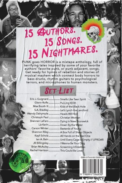 15 Authors. 15 Songs. 15 Nightmares. PUNK goes HORROR is a mixtape anthology, full of terrifying tales inspired by some of your favorite authors' favorite punk, or punk adjacent, songs. Get ready for hymns of rebellion and stories of musical mayhem which connect body horrors to bass drums, rhythm guitars to psychological terrors, and microphones to human monsters. Contributing Authors:William Sterling Eric J. Guignard Glenn Rolfe Max Booth III S.A. Bradley Wendy Dalrymple Christoph Paul Brennan LaFaro Liz Kerin Carson Winter Shannon Riley Kayli Scholz Ian A. Bain JR Billingsley Brian McAuley Rachel Harrison