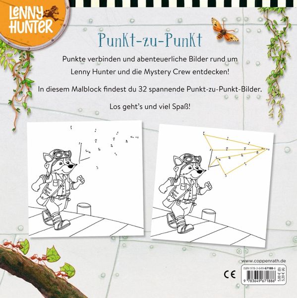 Punkte verbinden und abenteuerliche Bilder rund um Lenny Hunter und die Mystery Crew entdecken! Dieser coole Malblock enthält 32 abwechslungsreiche Punkt-zu-Punkt-Bilder mit Motiven im Zahlenraum von eins bis 30. Einfach die nummerierten Punkte in der richtigen Reihenfolge verbinden und schon entstehen spannende Bilder.