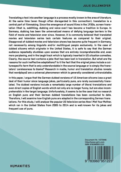 Translating a text into another language is a process mostly known in the area of literature. At the same time (even though often disregarded in this connection), translation is a central part of filmmaking. Since the emergence of sound films in the 1930s, screen translation (that is, subtitling, dubbing and voice-over) has become a tradition in Europe. In Germany, dubbing has been the universalized means of defying language barriers in the field of movie and television ever since. However, it is commonly believed that translated movies and television series lack certain features as compared to their original. Disapproval of dubbed movies and television shows has become quite frequent in Germany, not necessarily among linguists and/or multilingual people exclusively. In the case of dubbed sitcoms which originate in the United States, it is safe to say that the German audience repeatedly stumbles upon scenes that are entirely incomprehensible and, even more perplexing, end in the laugh track which is typically inserted in US situation comedies. Clearly, the source text contains a joke that has been lost in translation. But what are the reasons for such ineffective adaptations? Is it the fact that the original jokes include a culturespecific term that is only understandable in the source language or is simply the translators' carelessness to blame? Research in media, humor and translation studies reveals that wordplays2 are a universal phenomenon which is generally considered untranslatable.In this paper, I argue that the German dubbed versions of US American sitcoms lose a great deal of their humor since language jokes, particularly puns, are rarely successfully translated. The dubbed versions include a remarkably large number of literal translations and even direct copies of English words which not only are no longer funny, but are also incomprehensible in the target language. Unfortunately, it seems to be the case that no research on English puns and their German dubbed translations has been conducted to date. Therefore, I will examine how English puns are adapted in the corresponding German translations. For this study, I will analyze the popular US television series How I Met Your Mother, which ran in the United States from 2005 to 2014 and is well-known for its jokes and frequent use of puns.