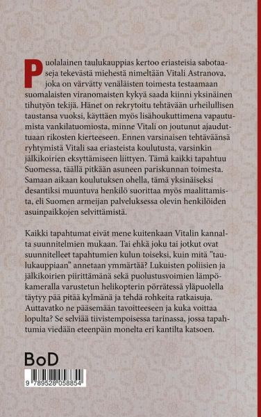 Puolalainen taulukauppias -romaani pohjautuu hyvin pitkälti tositapahtumiin pääosin vuoden 2010 syksyltä. Tuolloin Pohjois-Savossa, Kainuussa ja Pohjanmaalla liikkui mies, jota lehdistö alkoi nimittää ¿Sonkajärven ampujaksi¿, koska hän esimerkiksi tulitti haulikolla yhden anastamansa henkilöauton kyljen rei¿ille ja teki paljon muitakin tihutöitä. Kirjan juoni etenee niin ¿taulukauppiaan¿ kuin häntä kiivaasti etsivien poliisien näkökulmista tarkasteltuna. On hyvin vaikeaa päätellä, mikä tarinassa on tosielämässä tapahtunutta, poliisin esitutkintapöytäkirjoista lainattua kerrontaa ja mikä puolestaan kirjailijan fiktiivistä tuotosta. Savolaiseen tyyliin vastuu on niin sanotusti lukijalla. Henkilöiden maalittaminen, yhteiskunnan infrastruktuurille tärkeiden kohteiden sabotointi ja viranomaisten resurssien sitouttaminen liittyvät läheisesti kirjan juoneen. On jopa pelottavaa ajatella, että kaikki nämä asiat ovat tapahtuneet tai ainakin olleet suunnitelmissa tapahtua elävässä elämässä. Vai oliko kyseessä vain ujon omatoimimatkaajan visiitti kylmään pohjolaan, jossa hän joutui lähes puolivahingossa poliisien ja rajavartioston jahtaamaksi, koska halusi vain toteuttaa solmimansa diilin ja vapautua siten Venäjällä saamastaan vankilatuomiosta? Onko kirjan päähenkilö ainoa lajissaan, vai onko kenties Suomessa enemmänkin heitä, jotka aktivoituvat ¿pilliin puhallettaessä? Lue ja koe paikoin humoristinenkin, tositapahtumiin pohjautuva kertomus puolalaiseksi taulukauppiaaksi tekeytyvästä nykyajan desantista.