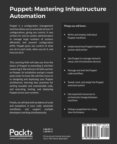 Start pulling the strings of your IT infrastructure effectively with Puppet - learn how to configure, customize and manage your systems more intelligently in an enterprise deployment. Key Features: - Step-by-step instructions to jump start your Puppet deployment and automate your IT configurations - Design, implement, and deploy Puppet in your infrastructure and tackle everyday IT infrastructure challenges - Gain expert understanding of Puppet's latest and most advanced features Book Description: Puppet is a configuration management tool that allows you to automate all your IT configurations, giving you control. It was written for and by system administrators to manage large numbers of systems efficiently and prevent configuration drifts. Puppet gives you control of what you do to each node, when you do it, and how you do it.This Learning Path will take you from the basics of Puppet to extending it and then mastering it. We will start off with a primer on Puppet, its installation and get a sneak peek under its hood. We will then move on to designing and deploying your Puppet architecture, learning best practices for writing reusable and maintainable code, and executing, testing, and deploying Puppet across your systems. Finally, we will deal with problems of scale and exceptions in your code, automate workflows, and support multiple developers working simultaneously.This course is based on the following books: - Puppet 4 Essentials - Second Edition - Extending Puppet - Second Edition - Mastering Puppet - Second Edition What You Will Learn: - Write and employ individual Puppet manifests - Understand how Puppet implements system abstraction - Use Puppet to manage network, cloud, and virtualization devices - Manage and test the Puppet code workflow - Tweak, hack, and adapt the Puppet extension points - Use exported resources to orchestrate change between machines - Debug a puppetserver using Java techniques Who this book is for: If you're an experienced IT professional and a new Puppet user, this course will provide you with all you need to know to go from installation to advanced automation.