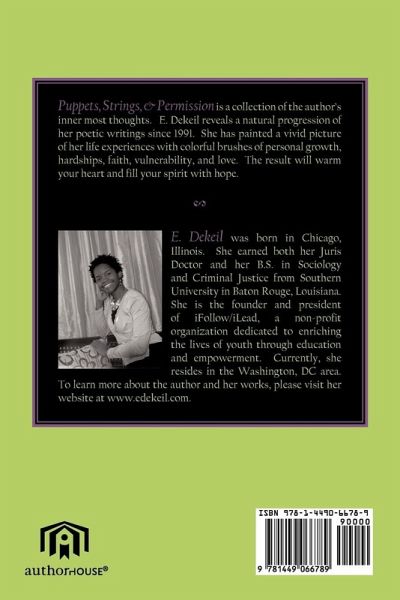 Puppets, Strings, & Permission is a collection of the author's inner most thoughts. E. Dekeil reveals a natural progression of her poetic writings since 1991. She has painted a vivid picture of her life experiences with colorful brushes of personal growth, hardships, faith, vulnerability, and love. The result will warm your heart and fill your spirit with hope.