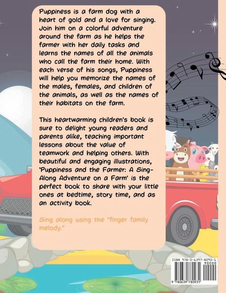 Puppiness is a farm dog with a heart of gold and a love for singing. Join him on a colorful adventure around the farm as he helps the farmer with her daily tasks and learns the names of all the animals who call the farm their home. With each verse of his songs, Puppiness will help you memorize the names of the males, females, and children of the animals, as well as the names of their habitats on the farm. This heartwarming children's book is sure to delight young readers and parents alike, teaching important lessons about the value of teamwork and helping others. With beautiful and engaging illustrations, 'Puppiness and the Farmer: A Sing-Along Adventure on a Farm' is the perfect book to share with your little ones at bedtime, story time, and as an activity book. Sing along using the "finger family melody."