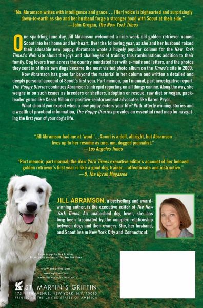 An instructive and marvelously entertaining chronicle of a puppy's first year, by the executive editor of The New York Times One sparkling summer day, Jill Abramson brought home a nine-week-old golden retriever named Scout. Over the following year, as she and her husband raised their adorable new puppy, Abramson wrote a hugely popular column for The New York Times's website about the joys and challenges of training this rambunctious addition to their family. Dog-lovers from across the country inundated her with e-mails and letters, and the photos they sent in of their own dogs became the most visited photo album on the Times's site in 2009. Now Abramson has gone far beyond the material in her column and written a detailed and deeply personal account of Scout's first year. Part memoir, part manual, part investigative report, The Puppy Diaries continues Abramson's intrepid reporting on all things canine. Along the way, she weighs in on such issues as breeders or shelters, adoption or rescue, raw diet or vegan, pack-leader gurus like Cesar Millan or positive-reinforcement advocates like Karen Pryor. What should you expect when a new puppy enters your life? With utterly winning stories and a wealth of practical information, The Puppy Diaries provides an essential road map for navigating the first year of your dog's life.