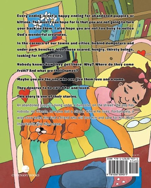 Every ending is not a happy ending for abandoned puppies or kittens. The most I can hope for is that you are not going to turn your back on them. I also hope you are not too busy to notice God's wonderful creatures. In the corners of our towns and cities, behind dumpsters and under park benches, hide these scared, hungry, thirsty beings, looking for their friends. Nobody knows how they get there. Why? Where do they come from? And what are their names? Maybe you are the one who can give them love and a name. They deserve to be cared for and loved. This story is one of their stories. An abandoned puppy is living under a dumpster on the street. The pup has nobody: no friends, no name but a slipper where he lives. Fortunately, a wise crow helps him find a friend who will love him and care for him. Most importantly, give him a name.