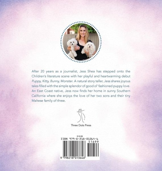 A playfully and heartwarmingly tale of puppy love! After 20 years as a journalist, Jess Shea has stepped onto the Children's literature scene with her playfully and heartwarmingly debut Puppy, Kitty, Bunny, Monster. A natural story teller, Jess shares joyous tales filled with the simple splendor of good ol' fashion puppy love. An East Coast native, Jess now finds her home in sunny Southern California where she enjoys the love of her two sons and their tiny Maltese family of three.