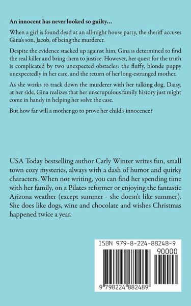 An innocent has never looked so guilty... When a girl is found dead at an all-night house party, the sheriff accuses Gina's son, Jacob, of being the murderer. Despite the evidence stacked up against him, Gina is determined to find the real killer and bring them to justice. However, her quest for the truth is complicated by two unexpected obstacles: the fluffy, blonde puppy unexpectedly in her care, and the return of her long-estranged mother. As she works to track down the murderer with her talking dog, Daisy, at her side, Gina realizes that her unscrupulous family history just might come in handy in helping her solve the case. But how far will a mother go to prove her child's innocence?