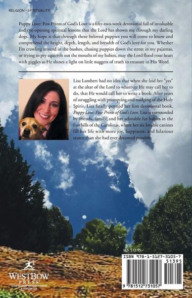 Puppy Love: Paw Prints of God's Love is a fifty-two-week devotional full of invaluable and eye-opening spiritual lessons that the Lord has shown me through my darling dogs. My hope is that through these beloved puppies you will come to know and comprehend the height, depth, length, and breadth of God's love for you. Whether I'm crawling around in the bushes, chasing puppies down the street in my pajamas, or trying to pry squirrels out the mouths of my babies, may the Lord flood your heart with giggles as He shines a light on little nuggets of truth to treasure in His Word.