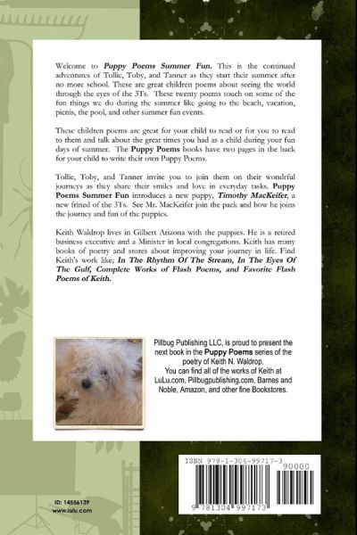 This is the next book in the series Puppy Poems by Keith N. Waldrop. Puppy Poems Summer Fun are children poems about all the fun things we do in the summer after school is out. Read the continued story of Tollie, Toby, and Tanner (the 3Ts) as they journey through life and have fun.