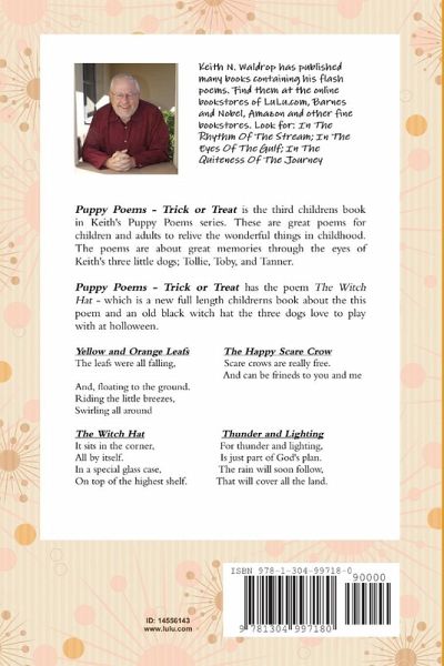 This is the third book of the series Puppy Poems by Keith N. Waldrop. Puppy Poems Trick or Treat captures the wonderful times of Halloween and the change of the season to fall. The poems are stories through the eyes of the three little puppies, Tollie, Toby, and Tanner. These are the continued stories from Puppy Poems, and Puppy Poems Summer fun.