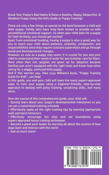 Break Your Puppy's Bad Habits & Raise a Healthy, Happy, Respectful, & Obedient Puppy Using this Kid's Guide to Puppy Training! There are only a few things as special as the bond between a child and their puppy. Family pets have long been known to provide us with unconditional emotional support. So when your child asks for a puppy for their birthday, you should get excited! Apart from emotional bonding, having a puppy is also a great way for you to teach your child about patience, empathy, compassion, and responsibilities since they require constant supervision and go through mood and developmental changes. However, as cute as a puppy may seem, it is crucial for you and your child to understand their needs in order for you to better care for them. More often than not, puppies are given up for adoption because families just aren't equipped with the right tools and know-how when caring for a wiggly, confused little puppy. And if this worries you, then Lucy William's book, "Puppy Training Guide for Kids", can help! In this guide, you and your child will learn the many expert-approved ways to train your puppy using a beginner-friendly, step-by-step approach to dealing with potty training, socializing skills, and many more. Over the course of this comprehensive guide, your child will:Quickly learn about your puppy's developmental milestones so you can set a customized training schedule Effortlessly apply all the right training tips by learning appropriate walk and leash behaviors Effectively encourage fun play and set boundaries using expert-approved house training techniques Become a great pack leader by learning all about the science of how dogs learn and interact with the world And so much more! Raising a puppy requires more than just warm, fuzzy cuddles and unlimited play time. In order for them to become a happy, well-adjusted, and well-behaved family companion, you must incorporate the necessary tools and tips found inside this book! Each chapter is filled with well-researched information straight from the experts, so that you and your child will be able to give your puppy the guidance they need! Help your child train your puppy the right way today!