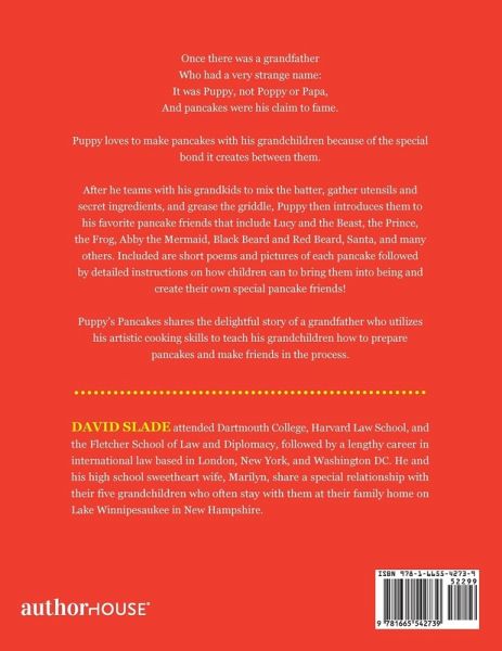 Once there was a grandfather Who had a very strange name: It was Puppy, not Papa or Grampa, And pancakes were his claim to fame. Puppy loves to make pancakes with his grandchildren because of the special bond it creates between them. After he teams with his grandkids to mix the batter, gather utensils and secret ingredients, and grease the griddle, Puppy then introduces them to his favorite pancake friends that include Lucy and the Beast, the Prince, the Frog, Abby the Mermaid, Black Beard and Red Beard, Santa, and many others. Included are short poems and pictures of each pancake followed by…mehr