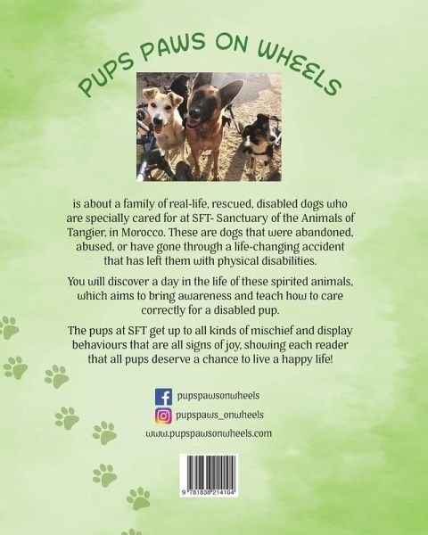A truly heart-warming day spent with the most glorious pups. Have you ever wanted to get away from the madness of everyday life and enjoy a really magnificent day? If you just said "yes" or nodded, one of the most amazing options available to you is to spend a day with our little furry companions. Very few activities come close to immersing yourself in the company of these lovely, playful, and the most adorable puppies. This is a wonderful true story about spending a day with disabled puppies. Despite experiencing challenges, they are eternally optimistic and let nothing stop them from having fun. Each of these cute pups has a distinct personality and a character to match. Their innocent antics makes one forget about everything else and just be with them, totally. This short tale is about the love and warm affinity that one lives through with our most treasured puppy friends. The text in this book is beautifully narrated with bright and happy illustrations that complement it perfectly. Not only will this storybook make you deliriously joyful, but it will also enable you to do something nice for these furry bundles of joy. The author has committed to donating 40% of the proceeds from the sale of this book to Sanctuary for the Animals in Tangier, Morocco (https://www.sftmorocco.org). The little pups appreciate your support. So, click the "Buy Now" button and be prepared to feel goosebumps and happy tingles all over yourself!