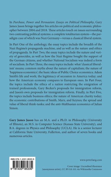 In Purchase, Power and Persuasion: Essays on Political Philosophy, Gary James Jason brings together his articles on political and economic philosopher between 2004 and 2018. These articles touch on issues surrounding two contrasting political systems: a complete totalitarian system-the paradigm case of which was Nazi Germany-versus a classical liberal system.