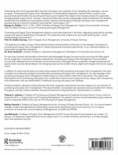 Thomas E. Johnsen is Professor of Purchasing and Supply Management at Audencia Business School, France, where he directs the M.Sc. in Supply Chain and Purchasing Management. His research revolves around sustainable supply networks and he is Associate Editor of the Journal of Purchasing and Supply Management. Mickey Howard is Professor of Supply Chain Management at the University of Exeter Business School, UK. His crrent research interests include interorganizational relationships, government mechanisms and circular economy. He is a regular contributor at events such as the Academy of Management, EurOMA and IPSERA. Joe Miemczyk is Professor of Supply Chain Management at ESCP Europe Business School based at the London, UK campus. He researches sustainable and circular supply chains in a number of sectors, publishing in a variety of supply chain and operations journals.