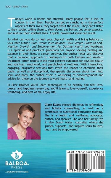 Today's world is hectic and stressful. Many people feel a lack of control in their lives. People can get so caught up in the surface aspects of their lives, they forget about the inside. They don't listen to their bodies telling them to slow down, eat better, get some exercise, and nurture their spiritual lives. A quick, downward spiral can result. So what can you do to heal your physical health and bring balance to your life? Author Clare Evans' Pure Balance: Your Simple Guide to Self- Healing, Growth, and Empowerment for Optimal Health and Wellbeing is a spiritual and practical guidebook for anyone seeking healing and balance in their lives. A cancer survivor, the author helps you discover that a balanced approach to healing-with both Eastern and Western traditions-often results in the most positive outcomes for physical health and spiritual, emotional, and psychological wellness. With interactive, engaging, pragmatic sections that invite the reader to chronicle their paths, as well as philosophical, therapeutic discussions about the mind, soul, and body, the author offers a wellspring of encouragement and advice for those on the journey toward health and healing. In Pure Balance you'll learn techniques to be healthy and feel love, peace, and happiness every day. You'll learn to love yourself, experience wellbeing, and best of all, enjoy life.