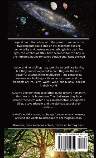 Legend has it that a boy with the power to summon the five elements could stop an evil man from seeking immortality and destroying everything in his path. For ages, the witches of Altair have searched for this boy in their dreams, but he remained elusive until Rene showed up. Isabel and her siblings may look like an ordinary family, but they possess a potent secret: they are the most powerful witches in the multiverse. Time paradoxes, werewolves, buildings with immense power, and the elements of Fire, Earth, Water, Wind, and Mind all coexist in their world. Austin's blunder leads to another quest to save humanity, this time in his hometown. The challenges they face include the Salem Witch Trials, mind control, unexpected allies, a love triangle, and the ultimate test of their abilities. Isabel's world is about to change forever when she meets a friend she wants to introduce to her magical realm. However, once someone enters, there's no turning back.