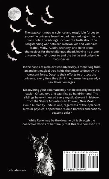 The saga continues as science and magic join forces to rescue the universe from the darkness lurking within the black hole. The siblings uncover the truth about the longstanding war between werewolves and vampires. Isabel, Molly, Austin, Anthony, and Rene brace themselves for the challenges ahead, leaving no stone unturned in their quest to end the battle and unite the two species. In the hands of a malevolent adversary, a mere twig from an ancient magical tree holds the power to destroy the crescent force. Despite their efforts to protect the universe, every time they think the danger has passed, a new threat emerges. Discovering your soulmate may not necessarily make life easier. Often, love and sacrifice go hand-in-hand. The siblings have witnessed every mystical event in history, from the Shasta Mountains to Roswell, New Mexico. Could humanity unite as one, regardless of their place of birth or physical appearance? Could borders and nations cease to exist? While Rene may be the dreamer, it is through the collective efforts of her family that this tale comes to life.