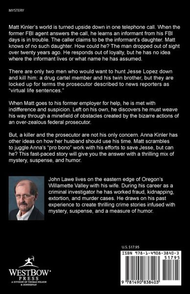 Matt Kinler?s world is turned upside down in one telephone call. When the former FBI agent answers the call, he learns an informant from his FBI days is in trouble. The caller claims to be the informant?s daughter. Matt knows of no such daughter. How could he? The man dropped out of sight over twenty years ago. He responds out of loyalty, but he has no idea where the informant lives or what name he has assumed. There are only two men who would want to hunt Jesse Lopez down and kill him: a drug cartel member and his twin brother, but they are locked up for terms the prosecutor described to news reporters as ?virtual life sentences.? When Matt goes to his former employer for help, he is met with indifference and suspicion. Left on his own, he discovers he must weave his way through a minefield of obstacles created by the bizarre actions of an over-zealous federal prosecutor. But, a killer and the prosecutor are not his only concern. Anna Kinler has other ideas on how her husband should use his time. Matt scrambles to juggle Anna?s ?pro bono? work with his efforts to save Jesse, but can he? This fast-paced story will give you the answer with a thrilling mix of mystery, suspense, and humor.