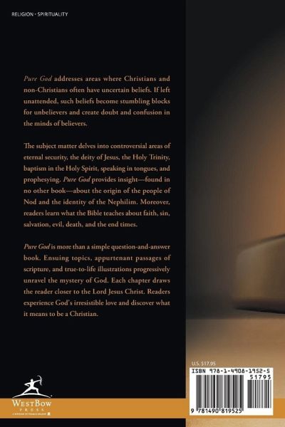 Pure God addresses areas where Christians and non-Christians often have uncertain beliefs. If left unattended, such beliefs become stumbling blocks for unbelievers and create doubt and confusion in the minds of believers. The subject matter delves into controversial areas of eternal security, the deity of Jesus, the Holy Trinity, baptism in the Holy Spirit, speaking in tongues, and prophesying. Pure God provides insight-found in no other book-about the origin of the people of Nod and the identity of the Nephilim. Moreover, readers learn what the Bible teaches about faith, sin, salvation, evil, death, and the end times. Pure God is more than a simple question-and-answer book. Ensuing topics, appurtenant passages of scripture, and true-to-life illustrations progressively unravel the mystery of God. Each chapter draws the reader closer to the Lord Jesus Christ. Readers experience God's irresistible love and discover what it means to be a Christian.