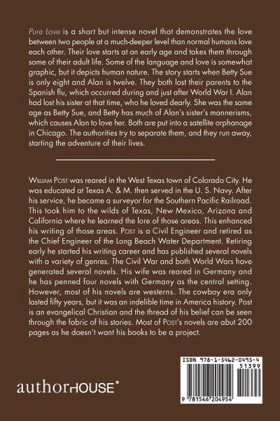 Pure Love is a short but intense novel that demonstrates the love between two people at a much-deeper level than normal humans love each other. Their love starts at an early age and takes them through some of their adult life. Some of the language and love is somewhat graphic, but it depicts human nature. The story starts when Betty Sue is only eight and Alan is twelve. They both lost their parents to the Spanish flu, which occurred during and just after World War I. Alan had lost his sister at that time, who he loved dearly. She was the same age as Betty Sue, and Betty has much of Alan?s…mehr