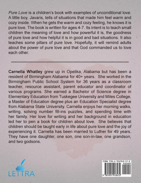 Pure Love is a children's book with examples of unconditional love. A little boy, Javaris, tells of situations that made him feel warm and cozy inside. When he gets the warm and cozy feeling, he knows it is pure love. The book is written for ages 4-7. Its intent is to teach small children the meaning of love and how powerful it is, the goodness of pure love and how helpful it is in good and bad situations. It also teaches some pillars of pure love. Hopefully, it will remind adults about the power of pure love and that God commanded us to love each other.