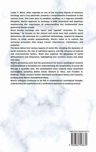 "I have always maintained that sociology is a science of liberation and not of restraint."Lester F. Ward, often regarded as one of the founding figures of American sociology and a true polymath, presents a comprehensive framework in this seminal work. This book aims to establish sociology as a rigorous scientific discipline. Ward's approach to sociology is both theoretical and empirical, emphasizing the importance of understanding the fundamental laws governing human society.Ward divides sociology into "pure" and "applied" branches. In "Pure Sociology," he focuses on the natural and social laws that underlie social phenomena. He advocates for a positivist methodology, inspired by Auguste Comte, to study society systematically. Ward's vision is to uncover the universal principles that shape human interactions, institutions, and evolution.The book delves into various aspects of social life, including the dynamics of social structures, the role of individual agency, and the influence of cultural and environmental factors. Ward also explores the processes of social differentiation and integration, highlighting how societies evolve and adapt over time.Ward's pioneering work laid the groundwork for future sociological research and established a foundation for understanding the complexities of social life through a scientific lens. His contributions have inspired many prominent sociologists, including Albion Small, Edward A. Ross, and Franklin H. Giddings. These scholars further developed sociological theory and research, building upon Ward's foundational ideas.Ward's influence continues to be felt in contemporary sociological thought, underscoring the significance of a methodical approach to studying society.