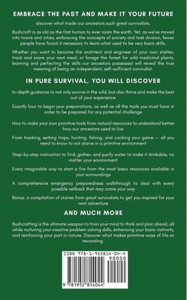 Embrace the past and make it your future: discover what made our ancestors such great survivalists. Are you attracted to the idea of simple living where you have no distractions, no demands on your time, and no news constantly bombarding you with things to worry about? Do you enjoy solitude and feel overwhelmed by a crowded world with so much background noise and activity, wanting to find peace and calm in the soothing embrace of nature? Or maybe you're worried that you've become too dependent on modern conveniences, and you want to go back to the roots of what made you human in the first place, regaining agency over yourself and your most basic needs... If any of the above sounds familiar, then bushcraft may be the answer you've been looking for all along. Bushcraft is as old as the first human to ever roam the earth. Yet, as we've moved into towns and cities, embracing the concepts of society and task division, fewer people have found it necessary to learn what used to be very basic skills. And those skills were almost lost to time... What was once our greatest achievement as a species soon became the source of our biggest dependency - we are no longer capable of surviving on our own, and if the structure we live in fails, we all fall with it. People are slowly waking up to that fact, and so should you. According to a recent Finder survey, roughly 20% of Americans, or about 52 million people, say they've spent money preparing or spent money on survival materials in the last 12 months. Whether you want to become the architect and engineer of your own shelter, start your own fire with nothing but a spindle and a board, track and snare your next meal, or forage the forest for wild medicinal plants, learning and perfecting the skills our ancestors possessed will reveal the true meaning of being an independent, self-sufficient survivalist. In Pure Survival, you will discover: 1. In-depth guidance to not only survive in the wild, but also thrive and make the best out of your experience 2. Exactly how to begin your preparations, as well as all the tools you must have in order to be prepared for any potential challenge 3. How to make your own primitive tools from natural resources to understand better how our ancestors used to live 4. From tracking, setting traps, hunting, fishing, and cooking your game -- all you need to know to not starve in a primitive environment 5. Step-by-step instruction to find, gather, and purify water to make it drinkable, no matter your environment 6. Every imaginable way to start a fire from the most basic resources available in your surroundings 7. A comprehensive emergency preparedness walkthrough to deal with every possible setback that may come your way And much more. Bushcrafting may seem like nothing more than a set of skills that allows you to get back to nature and thrive with just the bare minimum, but it's indeed much more than that.