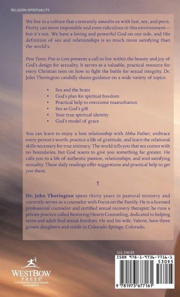 We live in a culture that constantly assaults us with lust, sex, and porn. Purity can seem impossible and even ridiculous in this environment-but it's not. We have a loving and powerful God on our side, and His definition of sex and relationships is so much more satisfying than the world's. Pure Teens: Free to Love presents a call to live within the beauty and joy of God's design for sexuality. It serves as a valuable, practical resource for every Christian teen on how to fight the battle for sexual integrity. Dr. John Thorington candidly shares guidance on a wide variety of topics: Sex and the brain God's plan for spiritual freedom Practical help to overcome masturbation Sex as God's gift Your true spiritual identity God's model of grace You can learn to enjoy a love relationship with Abba Father, embrace every person's worth, practice a life of gratitude, and learn the relational skills necessary for true intimacy. The world tells you that sex comes with no boundaries, but God wants to give you something far greater. He calls you to a life of authentic passion, relationships, and soul-satisfying sexuality. These daily readings offer suggestions and practical help to get you there.