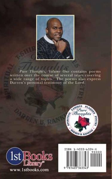Darren Barnard Rankins was born to James William and Barbara E. Rankins on September 24, 1966 in Rutherford County, Tennessee. He is the sixth child of seven children. He has one sister, Maxine, and five brothers: James, Kerry, Kevin, Felix, and Vernon. Darren resides in Murfreesboro, Tennessee with his lovely wife. In addition to his four wonderful children which he loves very much. Some of his greatest learning experiences have come from his children. Darren is a very talented poet. He began his writing career in sixth grade. He really became excited about poetry when the MTSU Honors Program Director, John Paul Montgomery suggested that Darren take part in the 1994 MTSU Poetry Slam. This was his first opportunity to share his poetry with other writers in an informal setting. He began to submit his poems to publishers and found satisfaction in seeing his work in print. He has since had publications in several magazines and newspapers. Darren began feeling that writing Christian poetry was a calling that God had for him to do. He wanted to find a way to make an even bigger impact with his poems, so he changed from writing as a hobby to starting his own business. He called his new business Pure Thoughts and things moved to a new level in 1995. This gave him an avenue to distribute the items he had begun to make. Darren expanded his talents to include designing plaques and Christian T-shirts. His plaques are beautifully made from wood and then lacquered to a shiny finish. Darren's biggest items are his several original screen-printed t-shirt designs. He writes an appropriate poem and then designs graphics that illustrate the meaning he wants to convey. Many of his T-shirts also contain Bible scriptures to emphasize the importance of his poems. Even though it is important for Darren to earn money to support his family, he also tries to find good causes to support. He has sold or donated over 5,000 T-shirts worldwide. Darren has a strong conviction that he can make a difference in people's lives by helping them to hear the word of God. He has struggled through hardships in his own life that have given him the strength and empathy to be sensitive to the needs of other around him. What are Darren's plans for the future? He will continue to write poetry to spread the word of God to others. As his name becomes more recognized, he hopes to expand his business as well. He continues to design t-shirts and loves to find new ways to share his designs with the community. www.purethoughts.info purethoughts24@yahoo.com Poet Rankins, Poet Darren, Darren B Rankins and Pure Thoughts Photograph on (Facebook) @Darren1966 (Pinterest) Darren_Rankins Google (Darren B. Rankins)