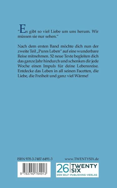 "Es gibt so viel Liebe um uns herum. Wir müssen sie nur sehen."Nach dem ersten Band möchte dich nun der zweite Teil "Pures Leben" auf eine wunderbare Reise mitnehmen. 52 neue Texte begleiten dich das ganze Jahr hindurch und schenken dir jede Woche einen Impuls für deine Lebensreise. Entdecke das Leben in all seinen Facetten, die Liebe, die Freiheit und ganz viel Wärme!