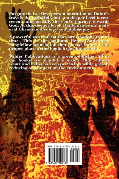 Purgatorio is a first person narration of Dante's travels through Hell, but at a deeper level it represents allegorically the soul's journey towards God. At this deeper level, Dante draws on medieval Christian theology and philosophy. A powerful work of art that has stood the test of time. This is the brilliant Henry Wadsworth Longfellow translation that placed Dante in his proper place in the English speaking world. Wilder Publications is a green publisher. All of our books are printed to order. This reduces waste and helps us keep prices low while greatly reducing our impact on the environment.