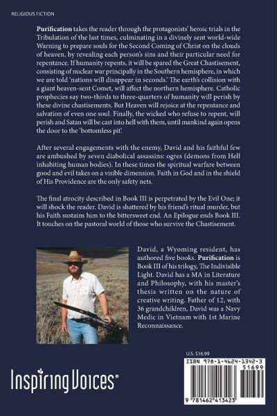 Purification takes the reader through the protagonists' heroic trials in the Tribulation of the last times, culminating in a divinely sent world-wide Warning to prepare souls for the Second Coming of Christ on the clouds of heaven, by revealing each person's sins and their particular need for repentance. If humanity repents, it will be spared the Great Chastisement, consisting of nuclear war principally in the Southern hemisphere, in which we are told 'nations will disappear in seconds.' The earth's collision with a giant heaven-sent Comet, will affect the northern hemisphere. Catholic prophecies say two-thirds to three-quarters of humanity will perish by these divine chastisements. But Heaven will rejoice at the repentance and salvation of even one soul. Finally, the wicked who refuse to repent, will perish and Satan will be cast into hell with them, until mankind again opens the door to the 'bottomless pit'. After several engagements with the enemy, David and his faithful few are ambushed by seven diabolical assassins: ogres (demons from Hell inhabiting human bodies). In these times the spiritual warfare between good and evil takes on a visible dimension. Faith in God and in the shield of His Providence are the only safety nets. The final atrocity described in Book III is perpetrated by the Evil One; it will shock the reader. David is shattered by his friend's ritual murder, but his Faith sustains him to the bittersweet end. An Epilogue ends Book III. It touches on the pastoral world of those who survive the Chastisement.