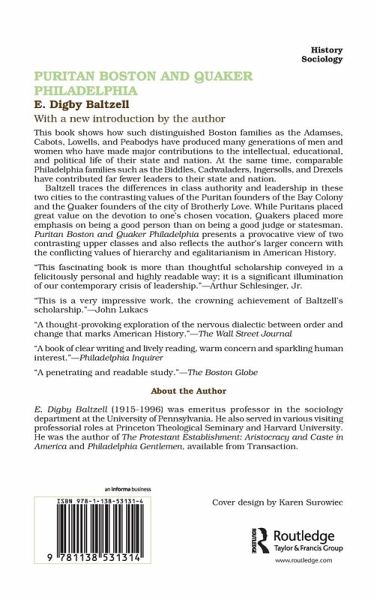 Baltzell traces the differences in class authority and leadership in Boston and Philadelphia to the contrasting values of the Puritan founders of the Bay Colony and the Quaker founders of the City of Brotherly Love.