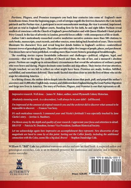 Puritans, Plagues, and Promises transports you back four centuries into some of England's most tumultuous times. From the beginning pages, a web of intrigue engulfs the first two characters: the Cole family patriarch and his Puritan vicar. A participant in secret nonconformist meetings, the vicar is arrested, imprisoned, and put on trial in England's highest courts. Standing firm for his faith, he and eight fellow Puritans reveal conflicts of conscience with the Church of England's powerful leaders and with Queen Elizabeth's hand-picked Privy Council. In the face of adversity in London, powerful forces collide-with consequences of life or death. Author Cole's meticulously researched creative nonfiction narrative contains more than 500 citations to early books, manuscripts, court records, and other sources, some dating back hundreds of years. These records illuminate his characters' lives and reveal long-lost details hidden in England's archives-underutilized treasure troves of genealogical gems. The author provides eighty-five images of people, places, and parchment. Two dozen have never been published, revealing more than twenty historic genealogical breakthroughs. The resulting stories expose formidable influences and challenges-political, religious, legal, and economic-that set the stage for conflicts of Church and State, the rule of law, and a monarch's absolute power. Puritans are caught up in extraordinary circumstances that reveal the adventures of ordinary people who were brave and daring. Plagues decimate some families and skip others. Their stories rivet our attention. Deeply touched, we are left to reflect on what might have been. Promises are made, broken, fulfilled, unfulfilled, and sometimes deferred. These multi-faceted storylines draw us into the lives of those who set the stage for colonizing America. As a fitting climax, the author delves deeply into the final straws that push, pull, and propel the author's ancestors and 21,000 other English men, women, and children to leave England during the Great Puritan Migration and forge new lives in America. The story of Puritans, Plagues, and Promises is one that represents us all.